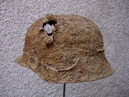 Dieser Helm wurde im Grab gefunden. Das Loch stammt von einem Artilleriegeschoss/Splitter.
